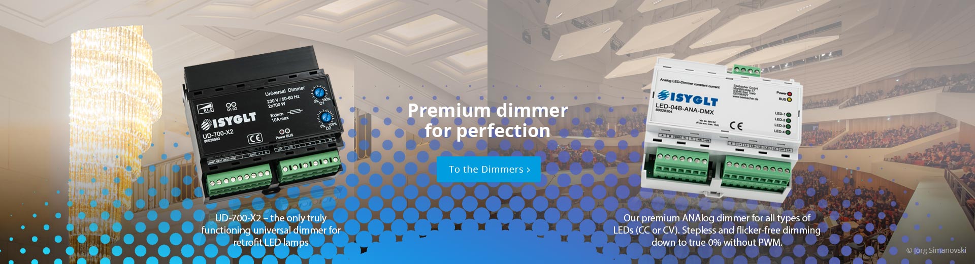 Light that is both optimal for event sequences and at the same time camera-compatible and 100% flicker-free! This task placed high demands on the coordination of the luminaires and dimmers. The ISYGLT LED dimmer LED-04B-ANA-DMX (the best on the market) and the high-quality luminaires from Climar LIGHTING in Portugal were the perfect combination!