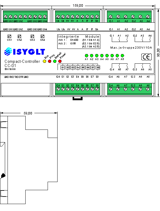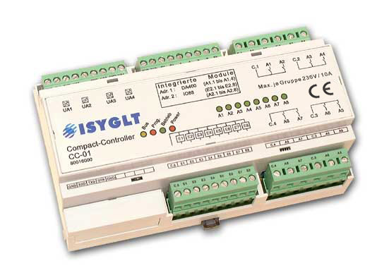 Der CC-01 Compact-Controller ist ein frei programmierbares Master-Modul des ISYGLT BUS-Systems. Durch hardwareseitige Anschlussmöglichkeiten sind mit dem Controller alleinstehend bereits kleinere Steuerungsaufgaben realisierbar. Durch die Erweiterung mit den ISYGLT BUS-Komponenten können vielfältige Steuerungsprojekte umgesetzt werden.
