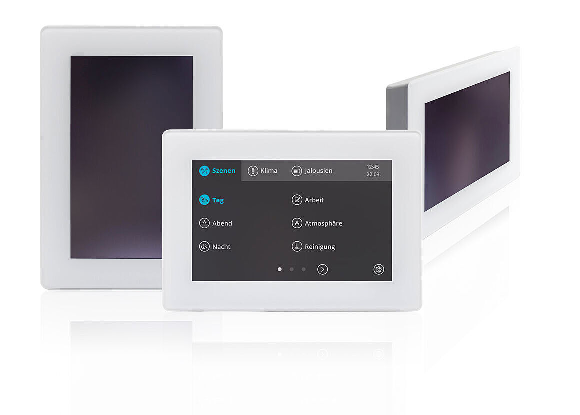 Multifunctional touch control panel with full-surface reflection-minimised glass front for mounting on a flush-mounted switch box. The touch panel is an ISYGLT BUS participant, so no network infrastructure is required. All necessary data is directly available at all times and even after a power failure, operation is possible again within 2-3 seconds.
