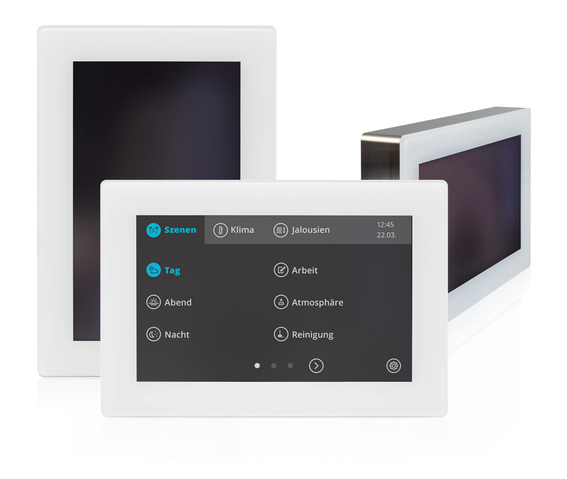Multifunctional touch control panel with full-surface reflection-minimised glass front for mounting on a flush-mounted switch box. The touch panel is an ISYGLT BUS participant, so no network infrastructure is required. All necessary data is directly available at all times and even after a power failure, operation is possible again within 2-3 seconds.