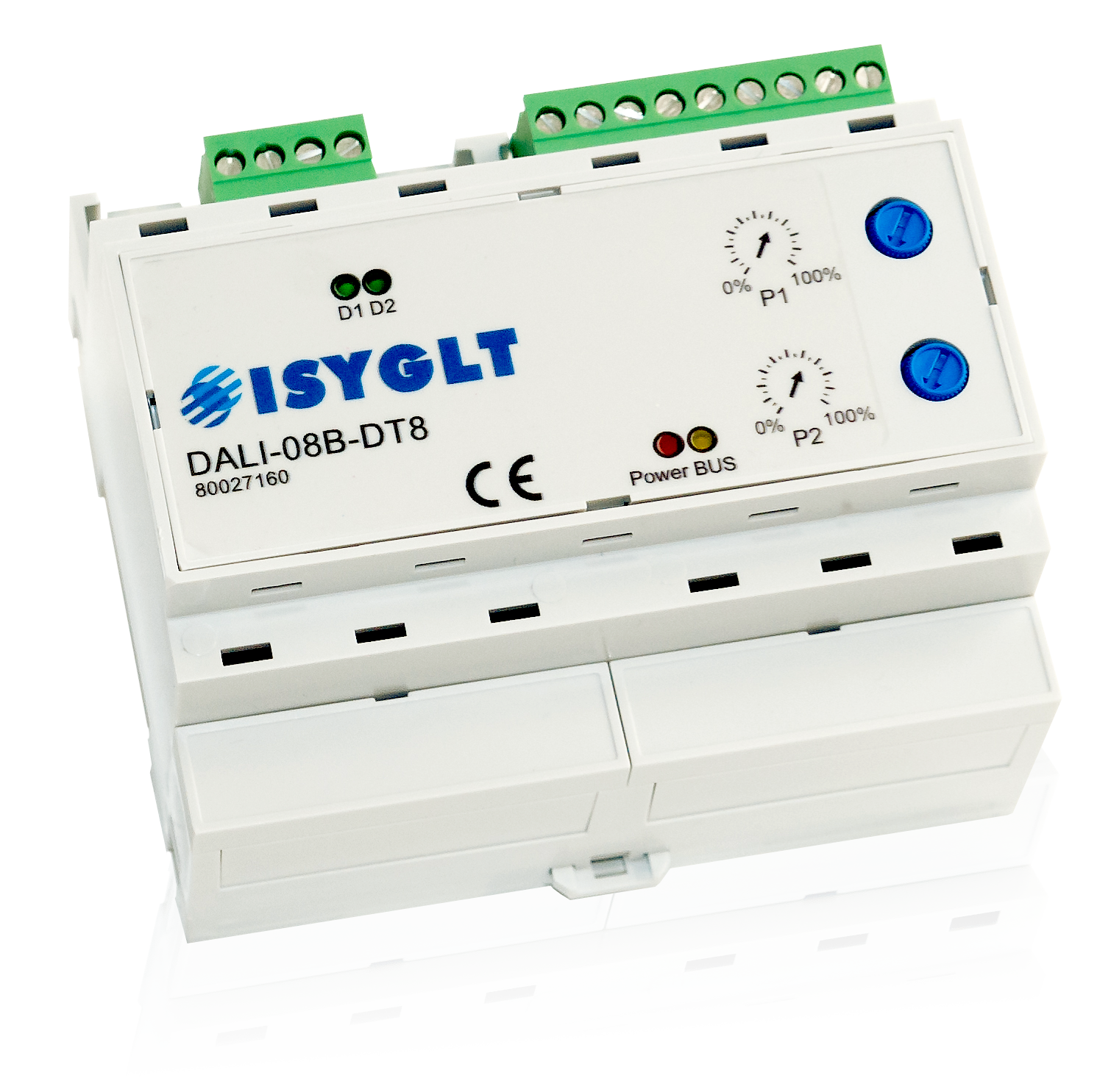 The DALI-08B-DT8 Module is used to control ECGs for fluorescent lamps and electronic transformers that communicate with the DALI protocol. Up to 64 electronic DALI ballasts can be operated on a DALI BUS. Each of these 64 DALI devices (ECGs or electronic transformers) must be programmed with a unique device address (DALI short address). Each device address can be assigned one of 8 ISYGLT dimming groups in up to 3 configurations (setups) by parameterising the DALI-08B-DT8 Module. These dimming groups have all the properties possible in the ISYGLT system with regard to scene storage, fade time calculations, etc. Furthermore, per dimming group the colour information can be controlled according to "Device-Type-8-Standard". Mixed operation of DT8 devices and standard DALI devices is possible without any problems.