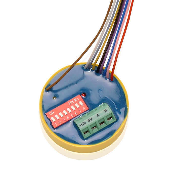 | Bauform | vergossen in gelber Kunststoffkappe zum Einbau in handelsübliche UP-Dosen oder Fremdgeräte |