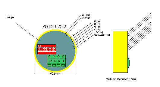 Das UP-Analog-Modul dient zum Einlesen von 2 separaten Analogwerten 0-5V in das Subnet. Die Auflösung jedes Kanals beträgt 8 Bit. Die einzelnen Analogkanäle stehen im Master-Modul zu weiteren Verknüpfungen, je nach Anwendungszweck, zur Verfügung. Gleichzeitig stehen auch noch 2 digitale Eingänge und 2 digitale Ausgänge zur Verfügung, an denen z.B. Tasten und Meldelampen angeschlossen werden können.