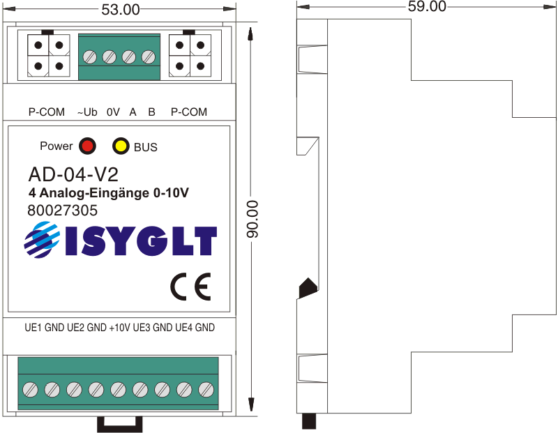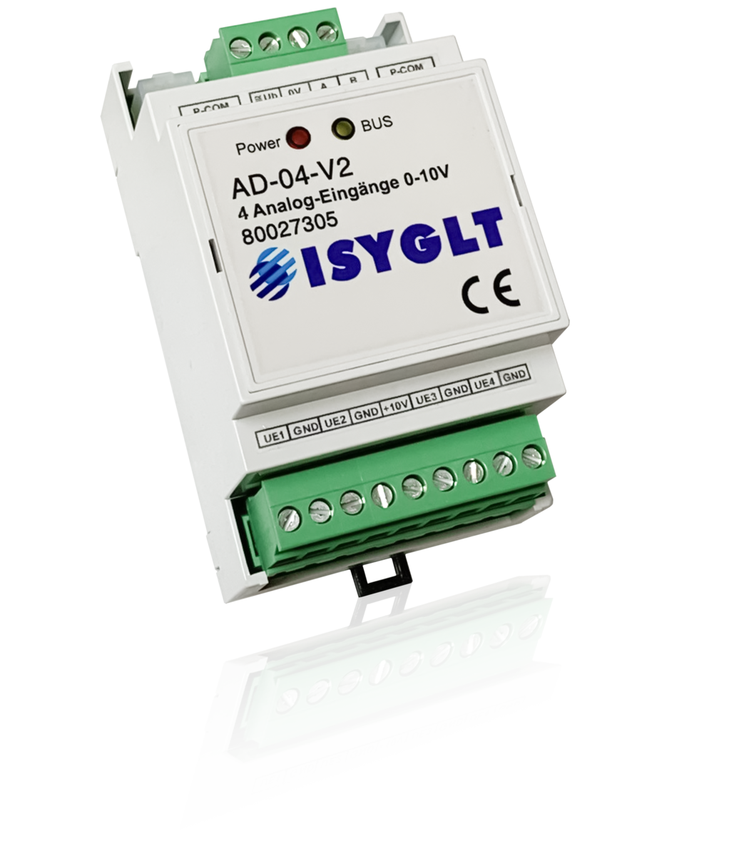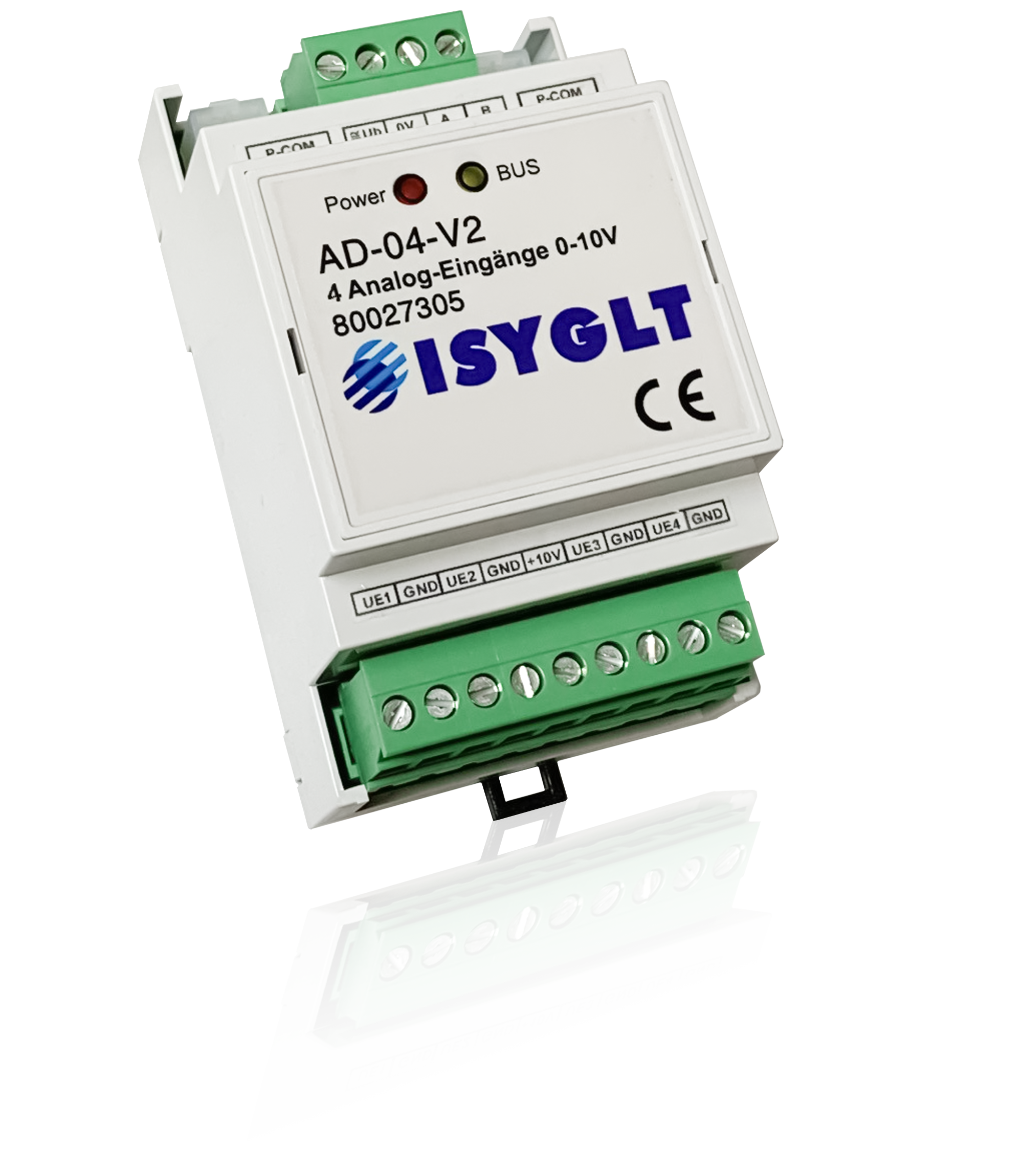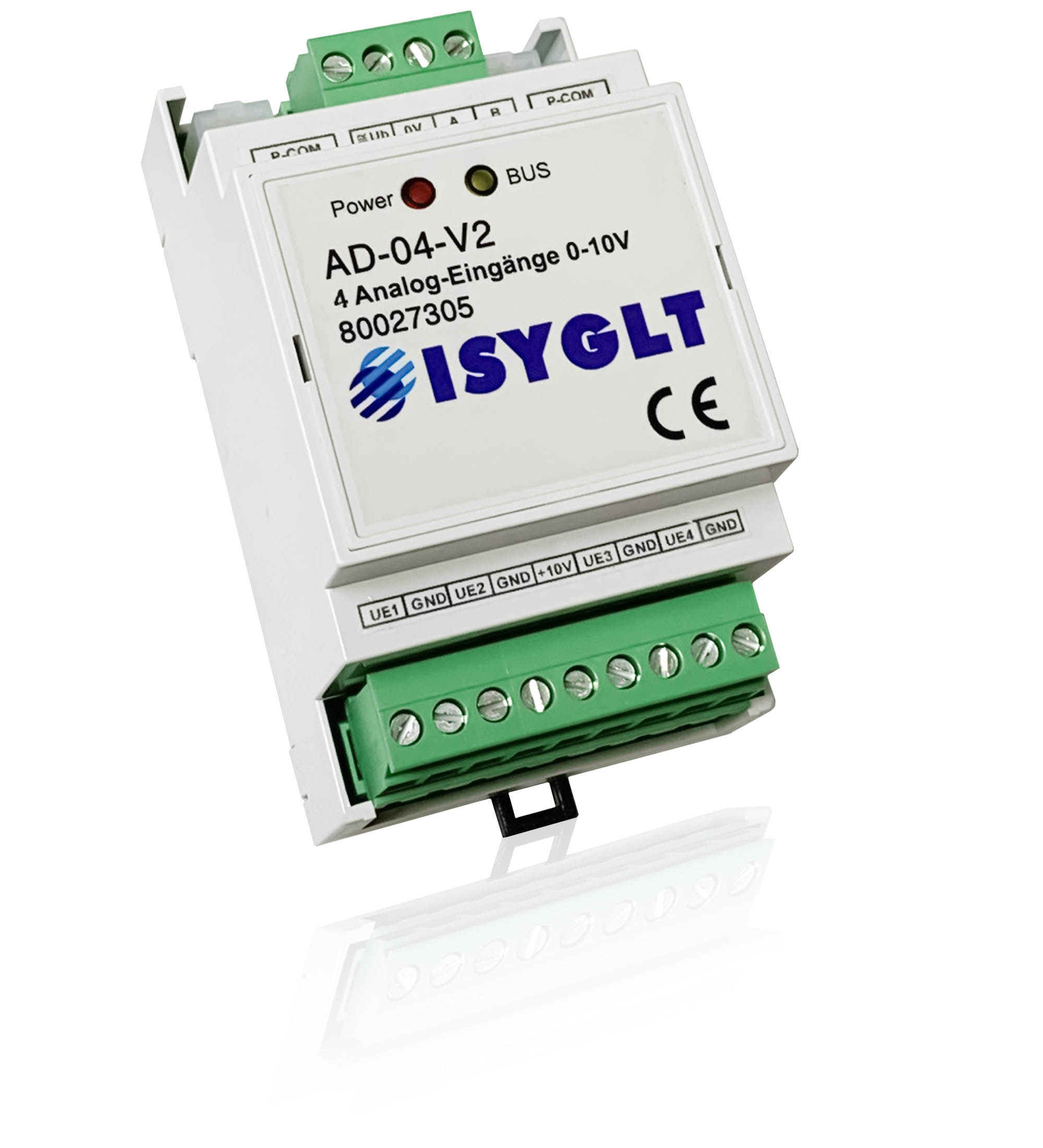 Analog-Modul zum Einlesen von 4 separaten Analogwerten 0-10V in das Subnet mit einer Auflösung pro Kanal von 8 oder 12 Bit.