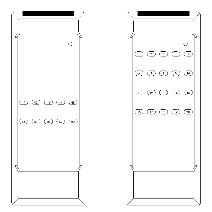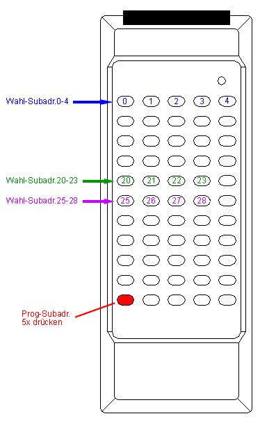 Die IR-Fernbedienung wird generell mit der Subadresse 0 ausgeliefert, die aber je nach Bedarf geändert werden kann. Hierzu muss die Batterie entnommen und wieder eingelegt werden. Es empfiehlt sich, bei entnommener Batterie eine beliebige Taste zu betätigen, so dass die Kondensatoren entladen werden. Nach dem Wiedereinlegen der Batterie muss die linke untere Taste 5 mal hintereinander gedrückt werden - jeder Tastendruck wird durch kurzes Blinken der roten LED quittiert. Anschließend wird die Subadresse über die Tasten der obersten Reihe eingegeben. Hier entspricht die linke Taste der Subadresse 0, die zweite Taste von links der Subadresse 1 usw. (Tastenbelegung für Subadressierung von links nach rechts: 0 -1 - 2 - 3 - 4)