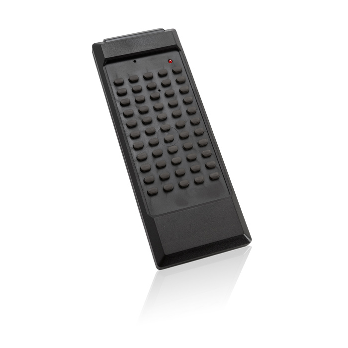 Für die Bedienung von einzelnen Räumen bietet sich die IRS-55T Fernbedienung an. Somit können Licht, Verschattung oder Medientechnik von jedem Punkt im Raum aus gesteuert werden. Die Übertragung erfolgt mit einer Frequenz von 455kHz und einem speziellen Protokoll, was höchstmögliche Störsicherheit gegen optische Einflüsse von Leuchten mit EVGs und Sonnenlicht garantiert.