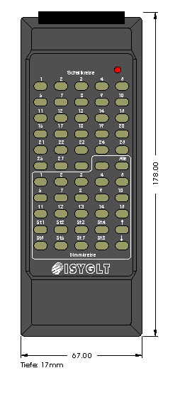 Mit dem ISYGLT-Infrarot-Handsender werden die Funktionen des BUS-Systems schnurlos ferngesteuert. Durch ein spezielles Übertragungsverfahren und einer Trägerfrequenz von 455kHz ist die Infrarotfernsteuerung unempfindlich gegen Störungen, wie diese z.B. durch regelbare Leuchtstofflampen (EVG) verursacht werden. Dies schließt die Funktionsprobleme der handelsüblichen 36kHz-Fernbedienungen aus. Zur Übertragung der Befehlssequenzen an das ISYGLT-BUS-System ist der IR-Empfänger IRE-U oder IRE-A erforderlich. Per Auswahl des Empfänger-Softwaremodus im ProgrammDesigner ist es möglich, die zu übertragenen Kanäle in ein höheres IR-Band zu verlegen, da die unteren Kanäle häufig auch von anderen IR-Sendern belegt werden und es so zu gegenseitigen Beeinflussungen kommen kann. Im Empfänger werden die Signale wieder nach 1-256 zurücktransferiert, sodass sie vom Programm verarbeitet werden können. Natürlich muss hierzu auch der IR-Handsender entsprechend eingestellt werden, Informationen hierzu finden sich unter "IR-Handsender IRS-55T - Subadressierung".