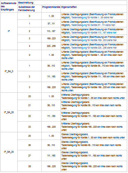 Die Kanalbelegung ist aus der folgenden Tabelle ersichtlich. Je nach eingestelltem Softwaremode des Empfängers wird dabei das Übertragungsband der Signale verändert. Bei den Softwaremodes IF_SA_20 und IF_SA_25 werden die selben Programmkanäle in einem höheren Band übertragen und erst im Empfänger wieder zurücktransferiert, so dass gegenseitige Beeinflussung mit Fremdsystemen auf IR-Basis vermieden wird.