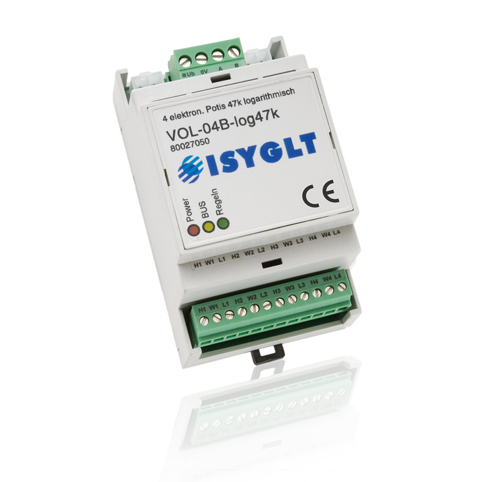 Das Lautstärke-Modul ist für die Lautstärke-Einstellung externer Audiogeräte über den BUS geeignet. Es besitzt 4 unabhängige Kanäle (elektronische Potis). Die Widerstandbereiche können via Software in den Grenzen von 0 bis 47k Ohm positiv logarithmisch verändert werden. Dies entspricht einer Dämpfung von 0dB bis -63dB und bei Mute >-90dB. Am Anschluss H wird die Signalquelle (z. B. ein CD-Player) angeschlossen. Anschluss L ist GND und W ist der Anschluss für den Verstärker-Eingang zur Lautstärke-Einstellung. Das Modul ist mit 2 Microcontrollern ausgestattet und kann deshalb auch sehr komplexe Befehle des Masters selbständig ausführen.