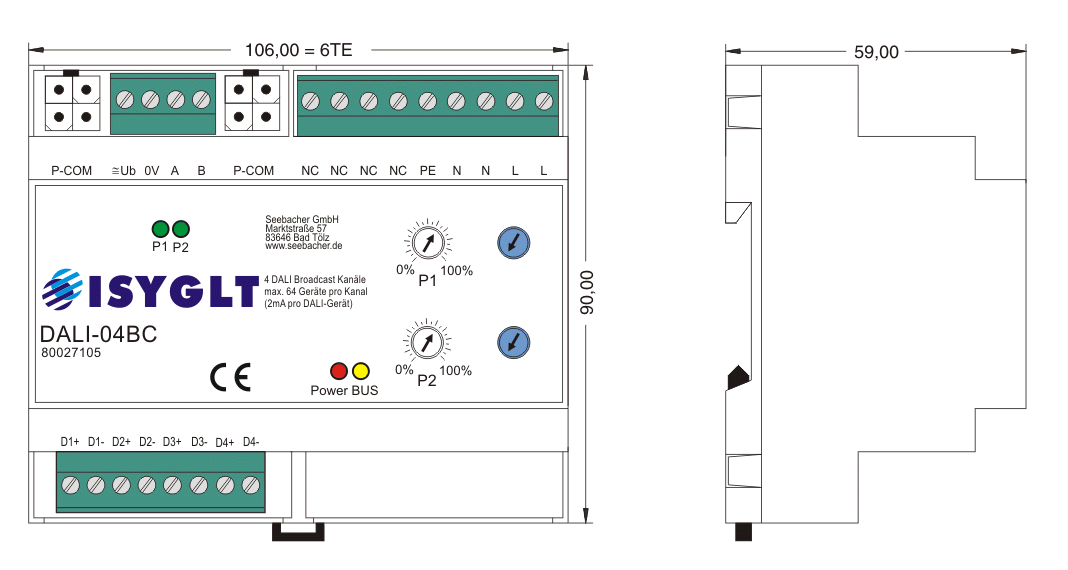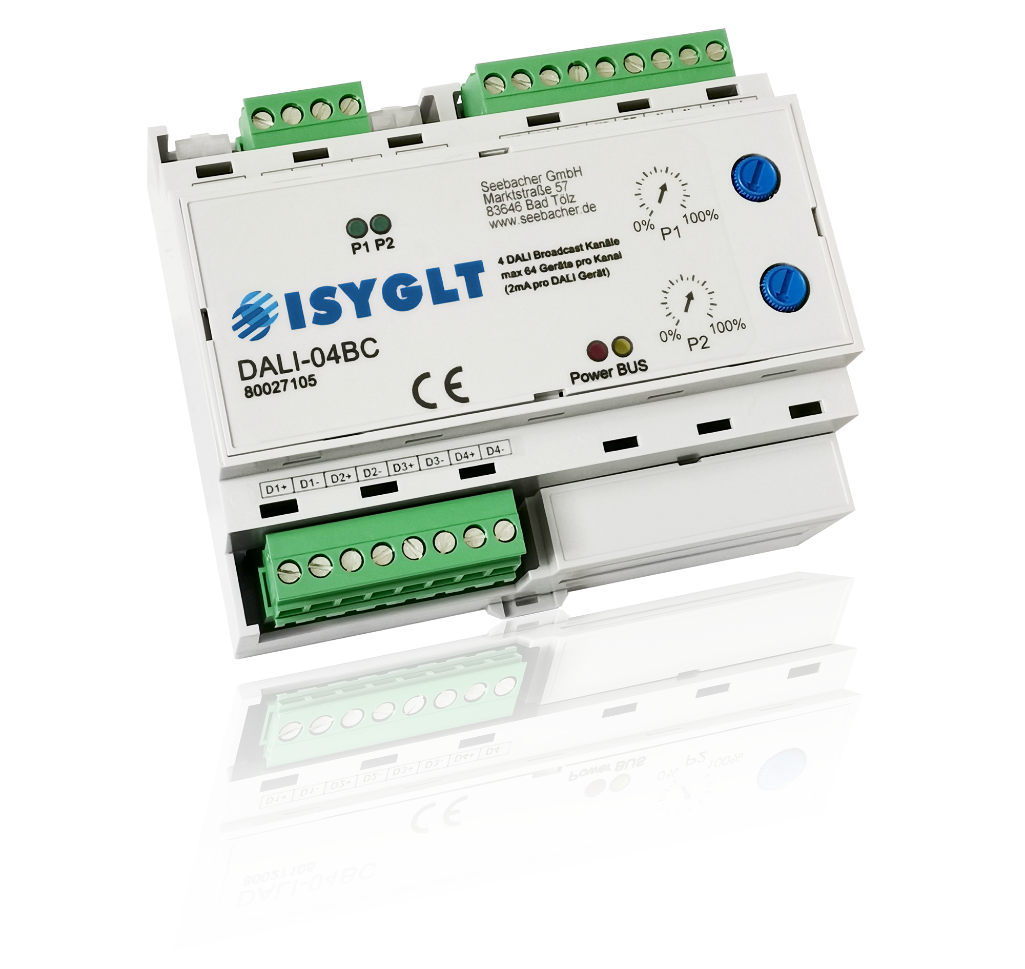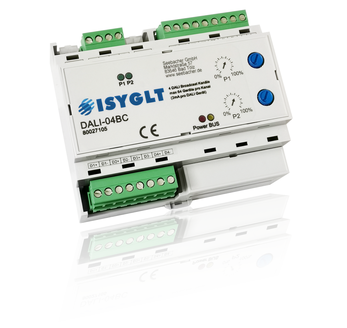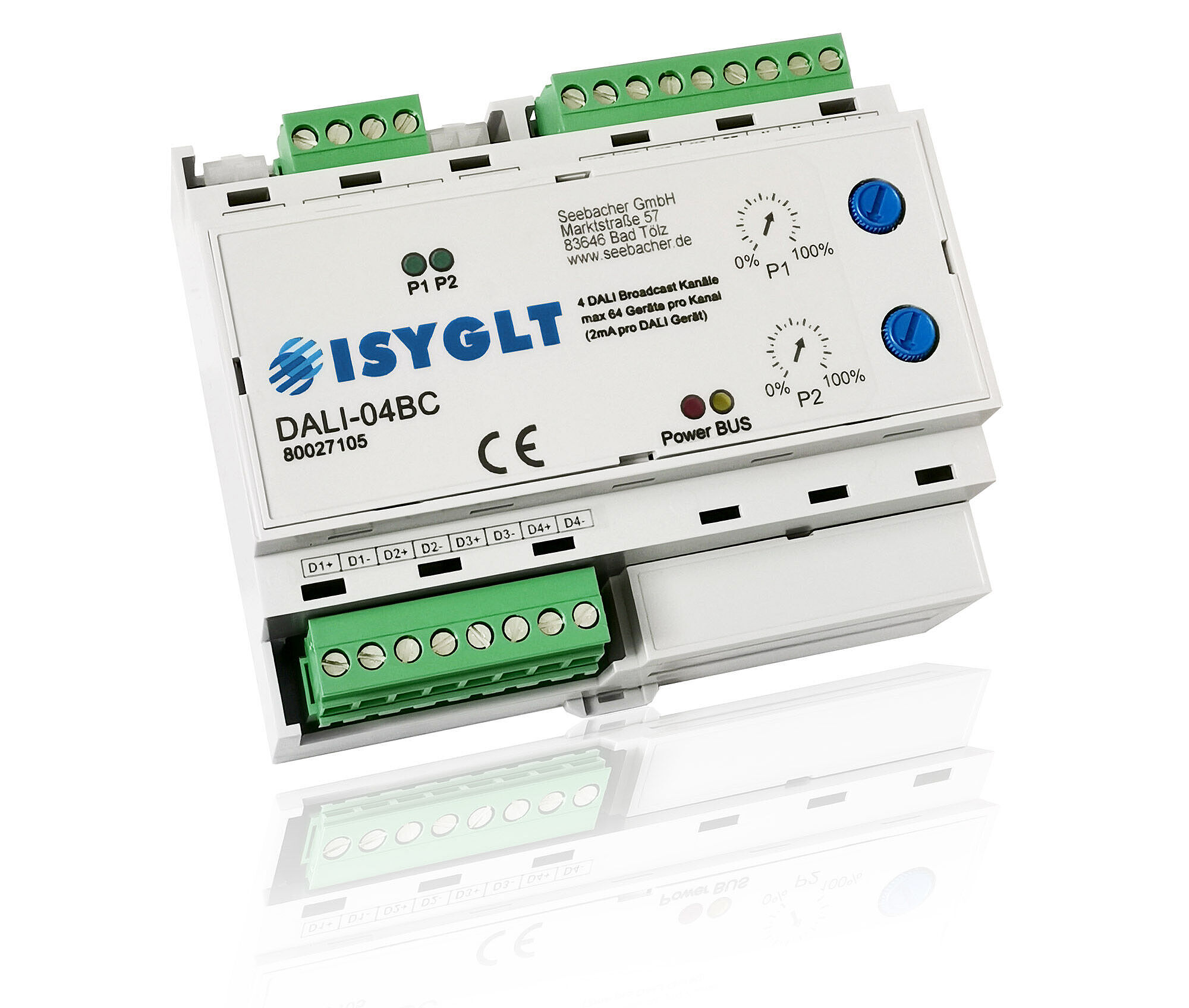 Das DALI-04BC-Modul dient zur Ansteuerung von elektronischen Vorschaltgeräten für Leuchtstofflampen und Niedervolt-Transformatoren, welche mit dem digitalen DALI-Signal kommunizieren können. Das Modul besitzt 4 separate DALI-Schnittstellen. An einen DALI-Kanal können max. 64 DALI-Standardlasten (2mA) angeschlossen werden.