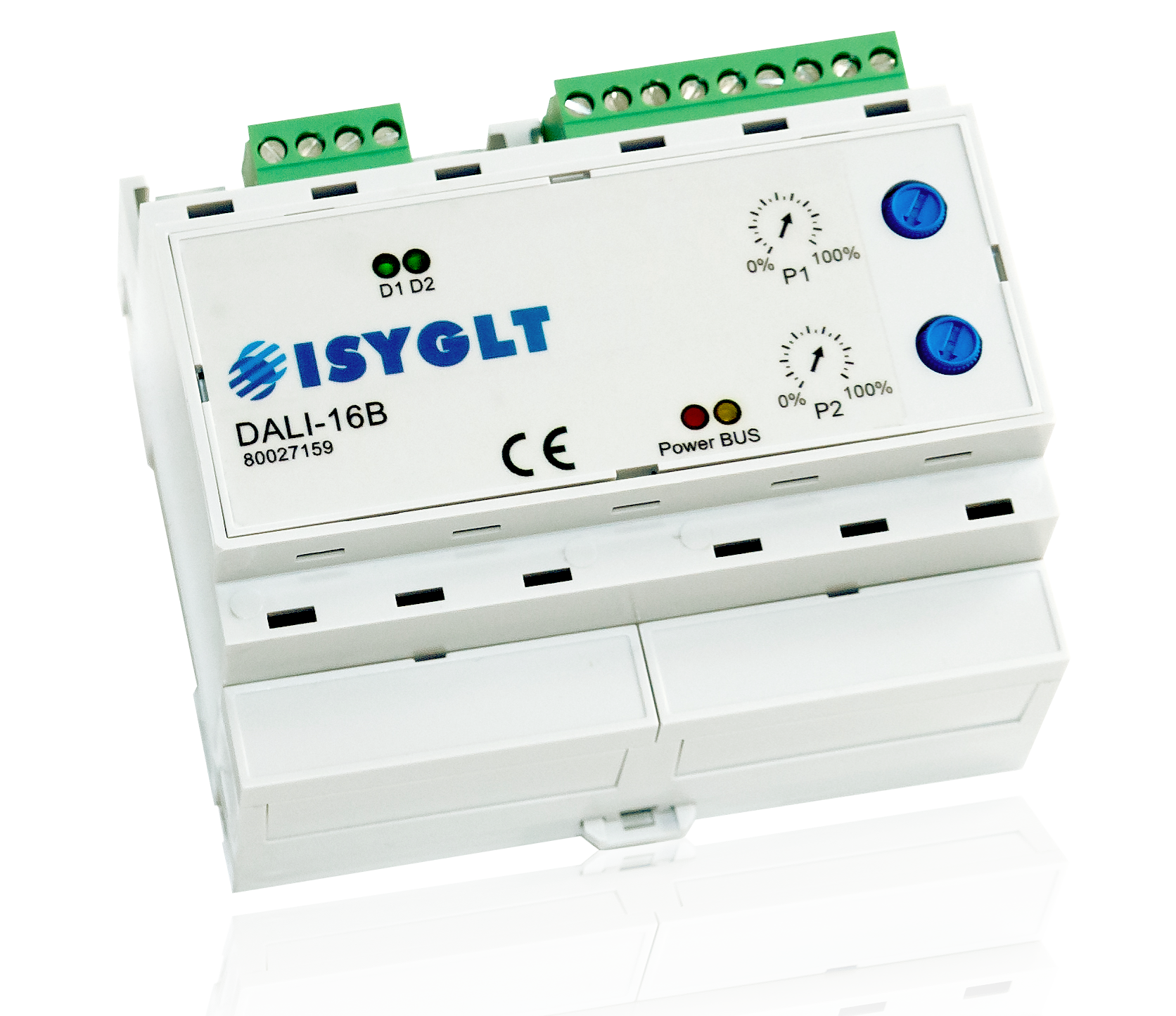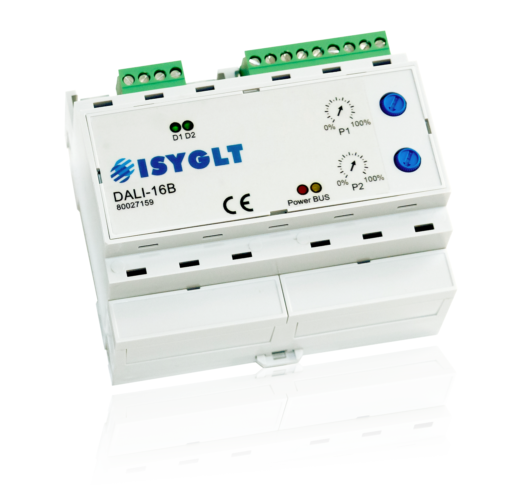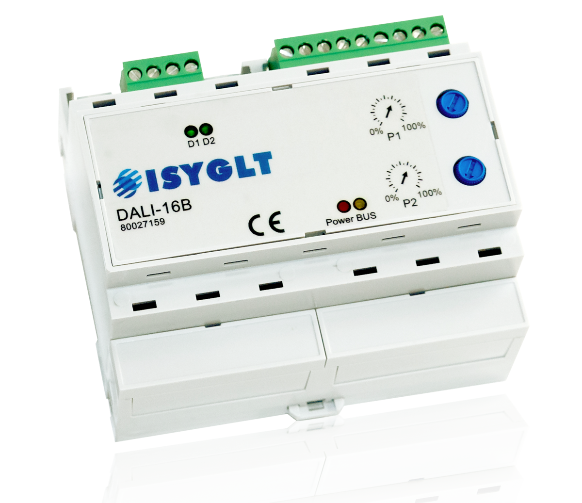 Das DALI-16B-Modul dient zur Ansteuerung von elektronischen Vorschaltgeräten für Leuchtstofflampen und elektronische Trafos, die mit dem DALI-Protokoll kommunizieren. An einem DALI-BUS können bis zu 64 DALI-EVGs (elektronische Vorschalt-Geräte) betrieben werden. Jeder dieser 64 DALI-Teilnehmer (EVGs oder elektronische Trafos) muss mit einer eindeutigen Geräte-Adresse (DALI-Short-Address) programmiert sein. Jeder Geräte-Adresse kann durch Parametrierung des DALI-16B-Moduls eine von 4, 8, 12 oder 16 ISYGLT-Dimmgruppen in bis zu 3 Konfigurationen (Setups) zugeordnet werden. Diese Dimmgruppen verfügen über alle im ISYGLT-System möglichen Eigenschaften bezüglich der Szenenspeicherung, Blendzeitberechnungen usw.
