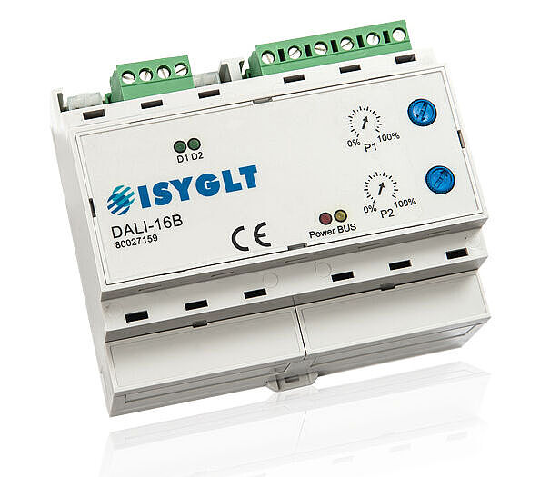 DALI-Modul zur Ansteuerung von bis zu 64 DALI-Leuchten. Jeder dieser 64 DALI-Teilnehmer wird mit einer eindeutigen Geräte-Adresse programmiert. Dieser Geräte-Adresse kann durch Parametrierung des DALI-16B-Moduls eine von 16 ISYGLT-Dimm-Gruppen zugeordnet werden.