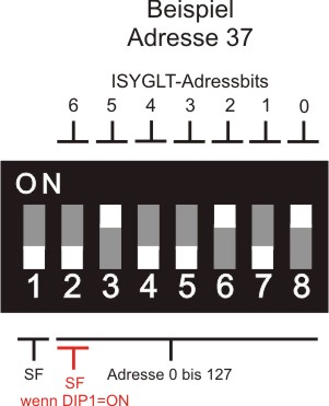 8-poliger DIP-Schalter zur Einstellung der ISYGLT-BUS-Adresse (0-127) befindet sich unter dem Deckel des Moduls.