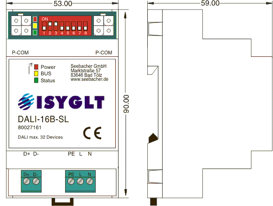 Kleines DALI-Modul mit nur 3 TE Platzbedarf zur Ansteuerung von bis zu 32 DALI-Leuchten. Jeder dieser 32 DALI-Teilnehmer wird mit einer eindeutigen Geräte-Adresse programmiert. Dieser Geräte-Adresse kann durch Parametrierung des DALI-16B-SL-Moduls eine von 16 ISYGLT-Dimmgruppen zugeordnet werden.