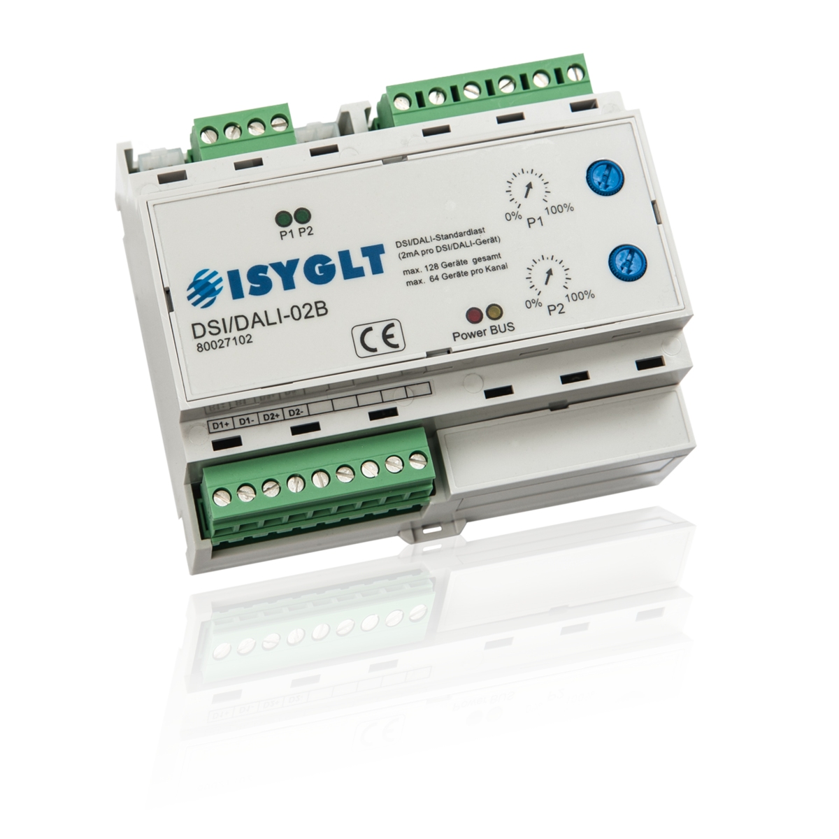 Das ISYGLT-DSI/DALI-02B-Modul dient zur Ansteuerung von elektronischen Vorschaltgeräten für Leuchtstofflampen und Niedervolt-Transformatoren, welche mit dem digitalen DSI- oder DALI-Signal kommunizieren können. Das Modul besitzt 2 separate DSI/DALI-Schnittstellen. An einen DSI/DALI-Kanal können max. 64 DSI/DALI-Standardlasten (2mA) angeschlossen werden. Das Netzteil des Moduls kann insgesamt (beide DSI/DALI-Kanäle) max. 128 DSI-Standardlasten treiben.