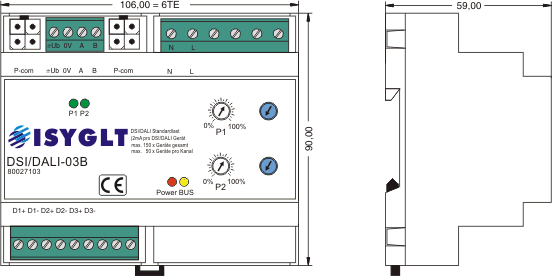 Das ISYGLT-DSI/DALI-03B-Modul dient zur Ansteuerung von elektronischen Vorschaltgeräten für Leuchtstofflampen und Niedervolt-Transformatoren, welche mit dem digitalen DSI- oder DALI-Signal kommunizieren können. Das Modul besitzt 3 separate DSI/DALI-Schnittstellen. An einen DSI/DALI-Kanal können max. 64 DSI/DALI-Standardlasten (2mA) angeschlossen werden. Das Netzteil des Moduls kann insgesamt (alle 3 DSI/DALI-Kanäle) max. 150 DSI-Standardlasten treiben.