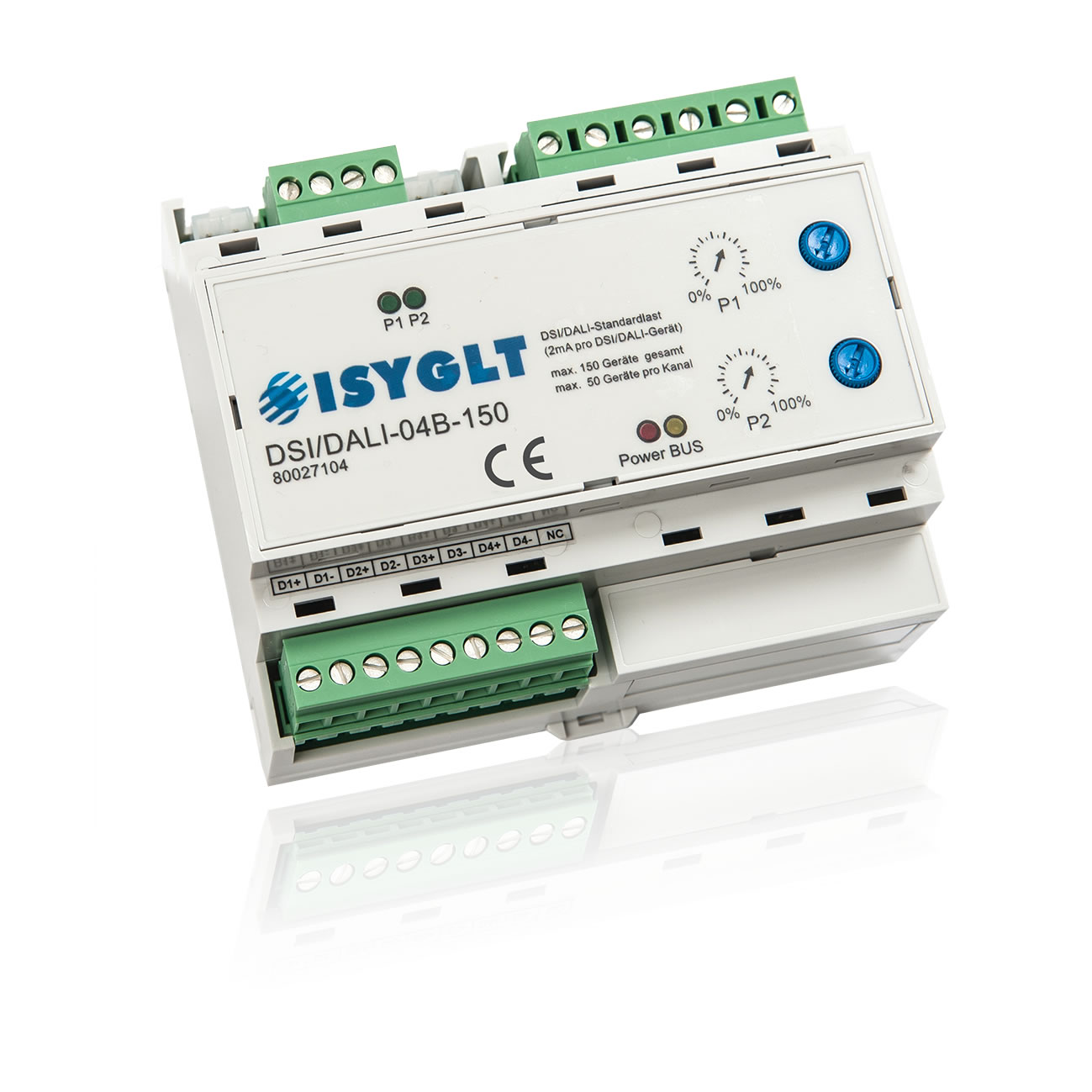 Das DSI/DALI-04B-150-Modul dient zur Ansteuerung von elektronischen Vorschaltgeräten für Leuchtstofflampen und Niedervolt-Transformatoren, welche mit dem digitalen DSI- oder DALI-Signal kommunizieren können. Das Modul besitzt 4 separate DSI/DALI-Schnittstellen. An einen DSI/DALI-Kanal können max. 64 DSI/DALI-Standardlasten (2mA) angeschlossen werden. Das Netzteil des Moduls kann insgesamt (alle 4 DSI/DALI-Kanäle) max. 150 DSI/DALI-Standardlasten treiben.