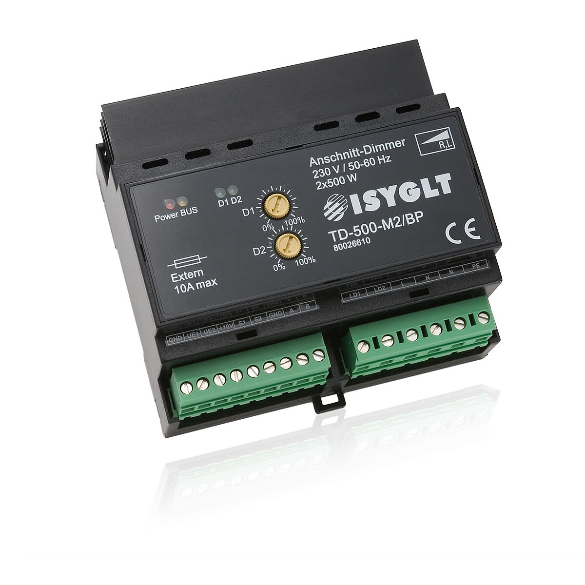 Thyristor-Dimmer in Phasenanschnitt-Technologie AGL, HV-Halogenleuchten, NV-Halogenleuchten mit magn. Trafo. 2 Kanäle mit jeweils bis zu 500W/VA.