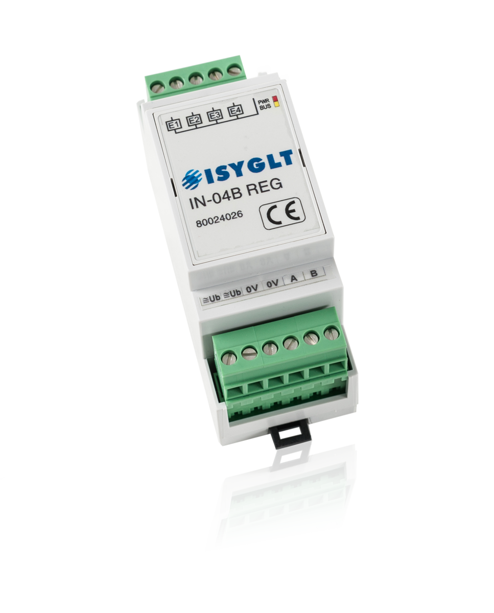 Mit dem IN-04B REG-Modul stehen 4 digitale Eingänge zum Anschluss von konventionellen Drucktasten, Schaltern und Kontakten zur Verfügung. Diese Eingänge werden an das BUS-System übergeben und stehen zur freien Verknüpfung zur Verfügung.