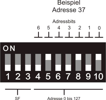 10-poliger DIP-Schalter zur Einstellung der ISYGLT-BUS-Adresse (0-127) befindet sich unter dem Deckel des Moduls.