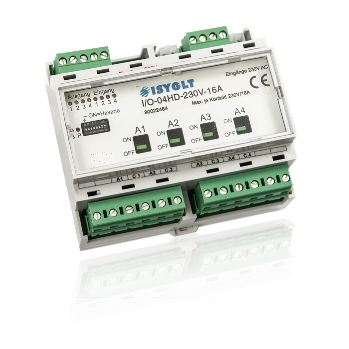 I/O-Modul mit 4 Optokoppler-Eingängen 230V und 4 Relais-Ausgängen 230V/16A mit Handbetätigungshebel. Vielfältige parametrierbare Sonderfunktionen.
