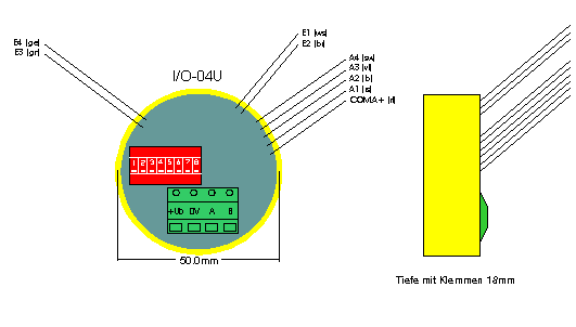 | Anschluss | Schraubklemmen 2,5mm² für BUS, Ein-/Ausgänge durch massive Drähte 0,8mm |