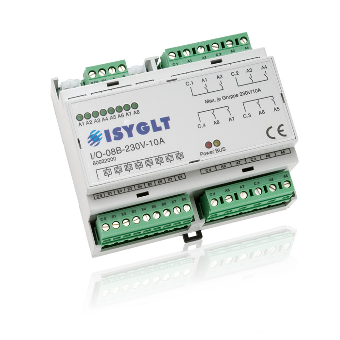 Mit dem I/O-Modul I/O-08B-230V-10A können 8 Stromkreise mit maximal 230V/10A (jeweils 2 Kontakte auf einer gemeinsamen Wurzel) geschaltet werden. Die Phasenlage der einzelnen Sicherungen ist beliebig. Als Eingänge stehen 8 Optokopplereingänge 12-48V auf einem gemeinsamen Gegenpotential zur Verfügung. Alle Ein- und Ausgänge sind über die Software in den Funktionen frei programmierbar.