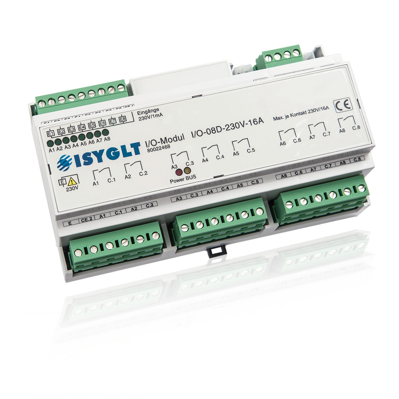 Mit dem I/O-Modul I/O-08D-230V-16A können 8 Stromkreise mit maximal 230V/16A geschaltet werden. Die Phasenlage der einzelnen Sicherungen ist beliebig. Als Eingänge stehen 8 Optokoppler-Eingänge 230V auf einem gemeinsamen Gegenpotential zur Verfügung. Alle Ein- und Ausgänge sind über die Software in den Funktionen frei programmierbar.
