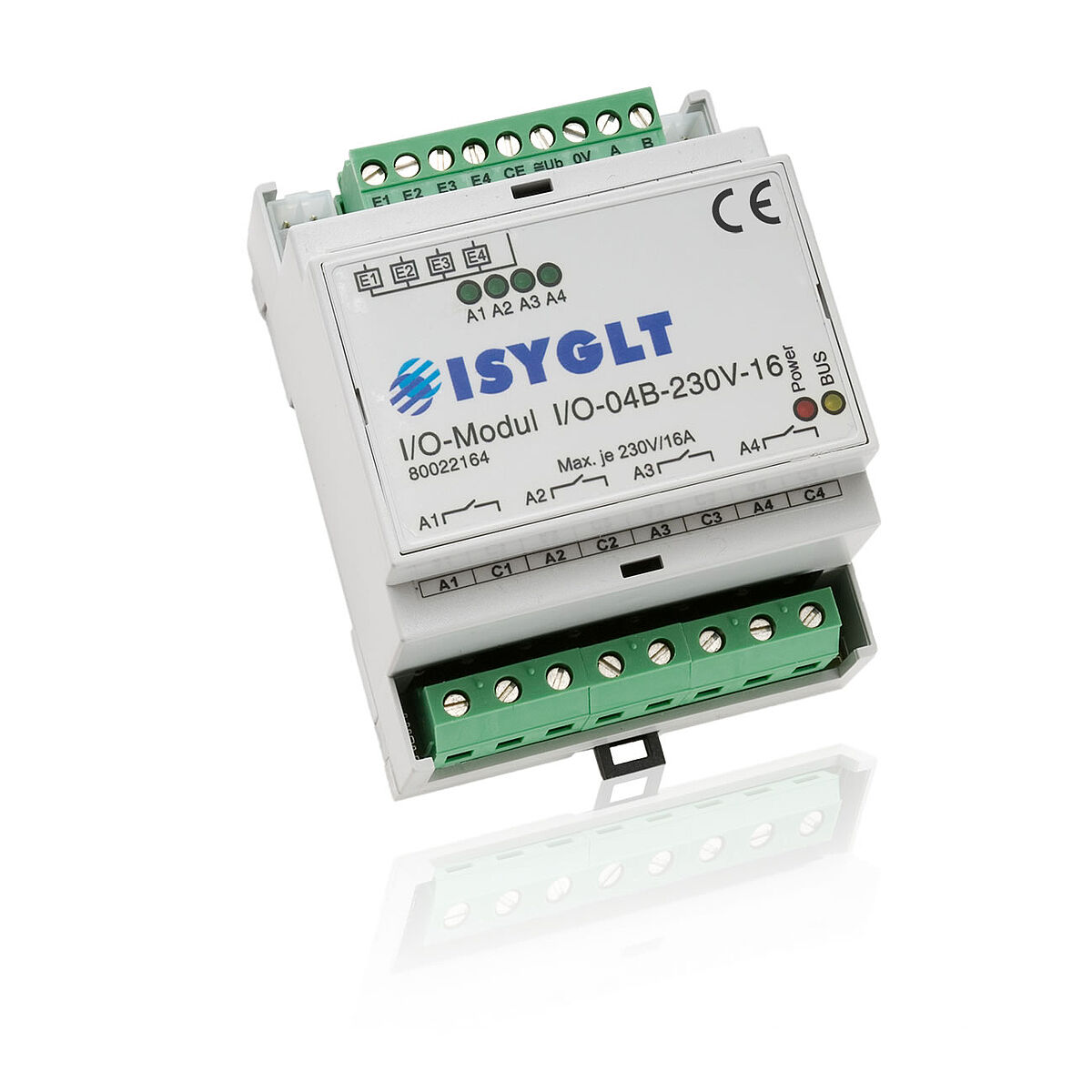 Mit dem I/O-Modul I/O-04B-230V-16A können 4 Stromkreise mit maximal 230V/16A geschaltet werden. Die Phasenlage der einzelnen Sicherungen ist beliebig. Als Eingänge stehen 4 Optokoppler-Eingänge 12-48V auf einem gemeinsamen Gegenpotential zur Verfügung. Alle Ein- und Ausgänge sind über die Software in den Funktionen frei programmierbar.
