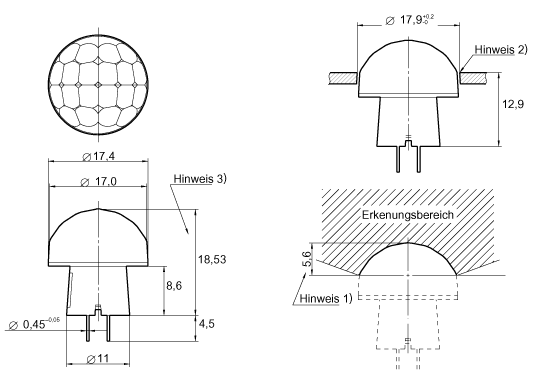 | Bauform (nur Sensor, lose) | weiße Kunststofflinse zum Einkleben in Geräte oder Leuchten |