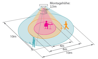 - Reichweite 10m tangential, 6m radial (bei 5m Montagehöhe)