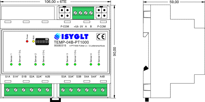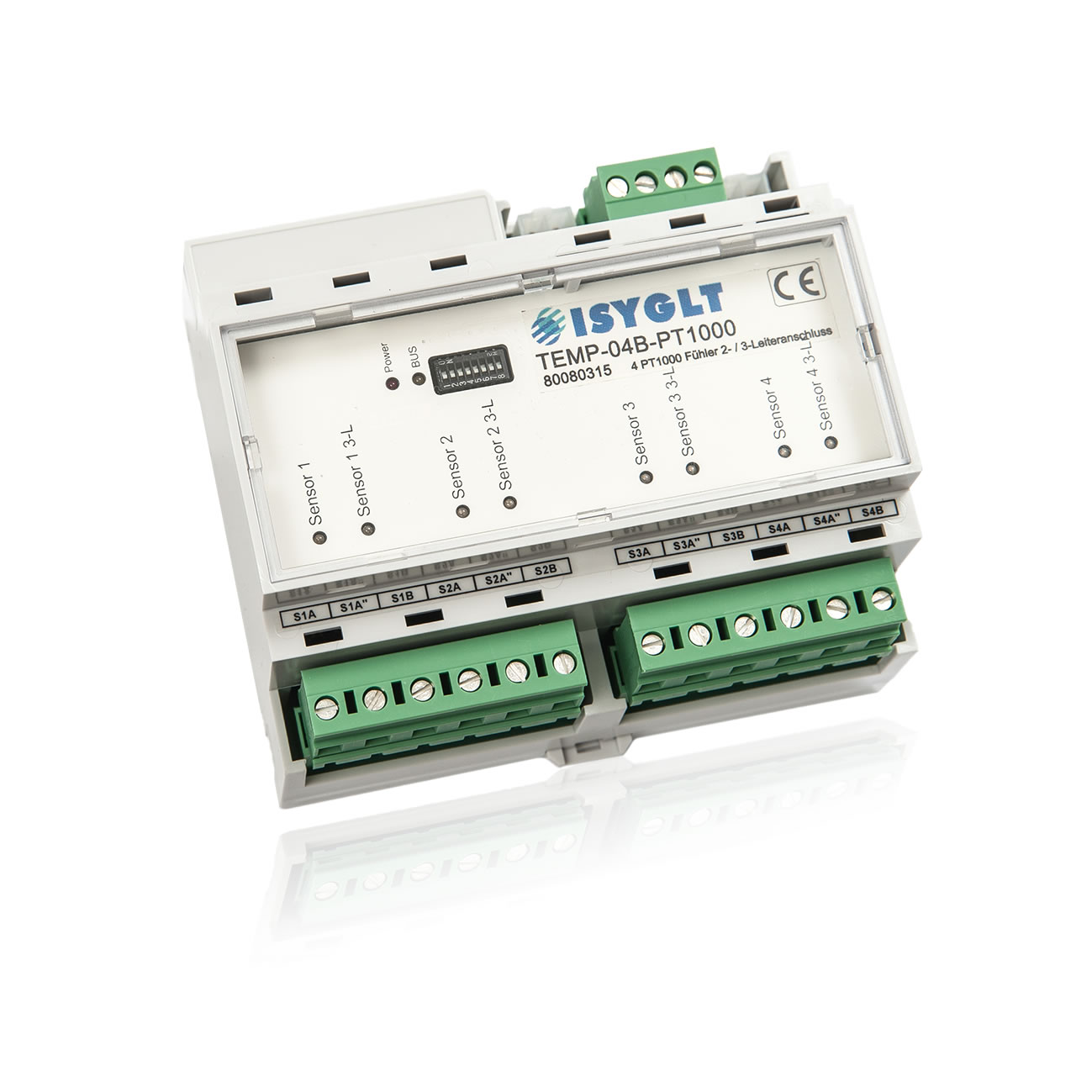 Das Temperatur-Modul dient zum Anschluss von am Markt weit verbreiteten PT1000-Temperatursensoren. Es stehen 4 Eingänge zur Verfügung. An jedem Eingang kann ein Sensor wahlweise in 2-Leiter- oder 3-Leiter-Beschaltung betrieben werden. Der Unterschied in den Anschlussvarianten liegt in der Genauigkeit der Auswertung. In der 2-Leiterschaltung addiert sich der Leitungswiderstand zum Sensorwiderstand. In der 3-Leiterschaltung wird der Leitungswiderstand in der Auswertung berücksichtigt - somit ist eine wesentlich höhere Messgenauigkeit erzielbar. Die Weitergabe der Daten an den ISYGLT-BUS erfolgt wahlweise als 8- oder 16-Bit Wert. Der Messbereich ist in dieser Technologie von -100°C bis +300°C definiert, jedoch von der Bauform und Spezifikation des verwendeten Sensors abhängig.