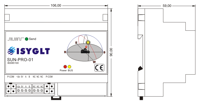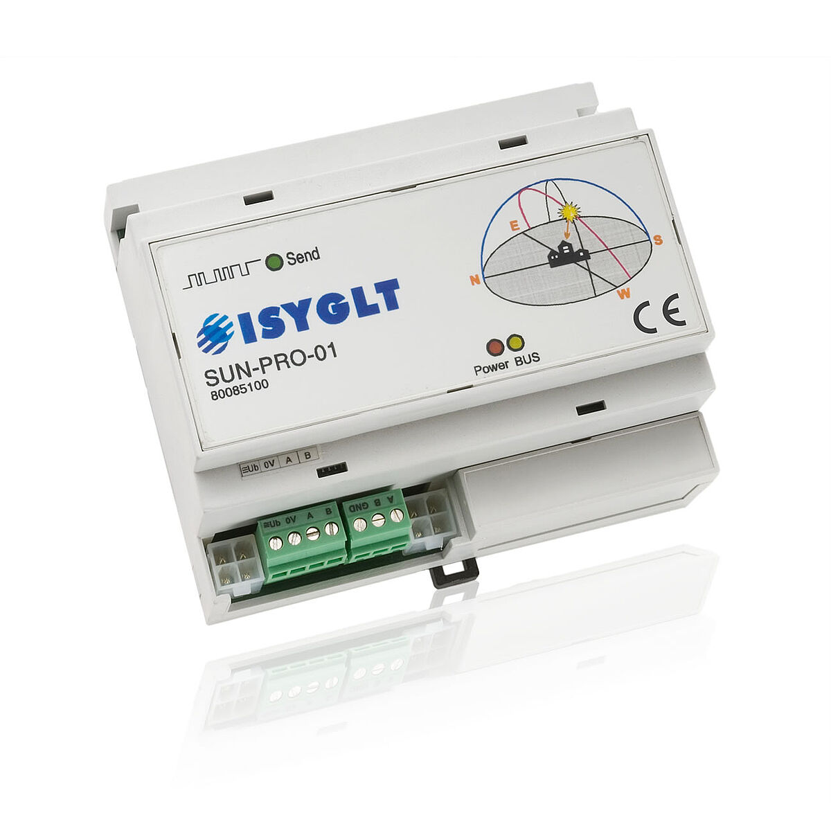 Der SUN-PRO-01 berechnet in Abhängigkeit von Gebäudeposition, Datum und Uhrzeit den momentanen Sonnenstand. Er kann beispielsweise bei einer komplexen Jalousiesteuerung mit Kunstlichtkorrektur oder einer Farbtemperatursteuerung nach Sonnenstand verwendet werden.