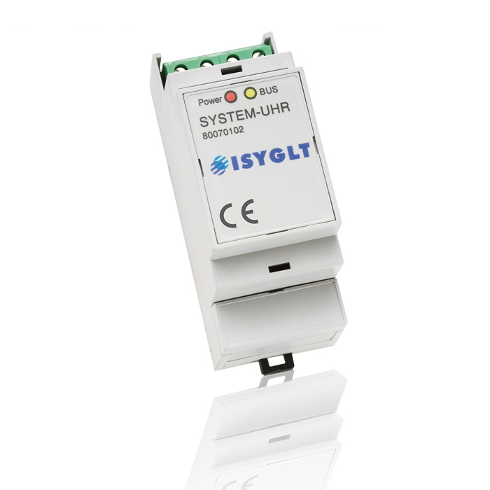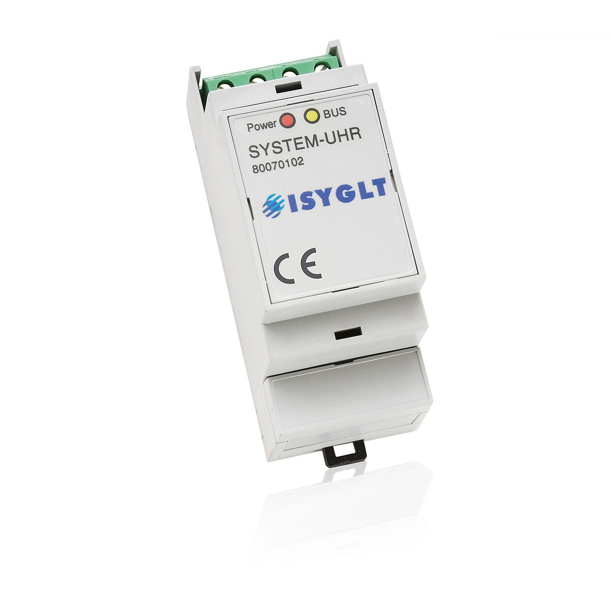 Mit der Systemuhr können Funktionen des ISYGLT-Systems zeitabhängig gesteuert werden. Das Systemuhr-Modul stellt dem Master-Modul die genaue Uhrzeit, das Datum und den Wochentag (Sommer-, Winterzeit und Schaltjahr werden automatisch berücksichtigt) über das Subnet zur Verfügung. Im Master-Modul können per kostenlosem Softwaretool bis zu 128 Schaltzeiten und bis zu 128 Schalttage komfortabel verwaltet werden. Das Systemuhr-Modul wird über die Parametrierfunktion im ISYGLT ProgrammDesigner eingestellt. Des Weiteren besteht die Möglichkeit, die Uhr durch eine übergeordnete Hauptuhr per Systemvariablen (Stunden und Minuten) zu synchronisieren. Die Systemuhr hat bei Betriebsspannungsausfall eine Gangreserve von min. 5 Jahren.