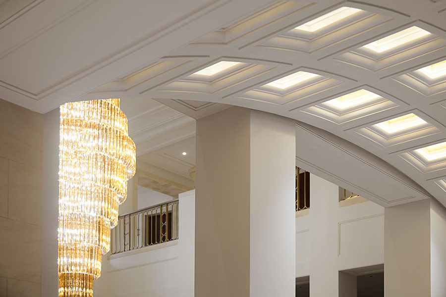 Das absolute Highlight bei der Beleuchtung ist die Kassettendecke. Die einzelnen Kassetten werden mit LED-Stripes beleuchtet, welche separat angesteuert werden. Daher sind insgesamt 1500 DALI-Adressen sowie 110 Dimmkreise vergeben. Die Kassettendecke und ihre Beleuchtung können ganz besonders aufeinander abgestimmt werden. Wie vom Kunden gewünscht, wird die Beleuchtung mit jedem Kreis nach innen heller. So kommt die Tiefe besonders zur Geltung. In der Profi-Einstellung auf dem Touch-PC können die Abstufungen für jeden Kreis genau definiert werden.