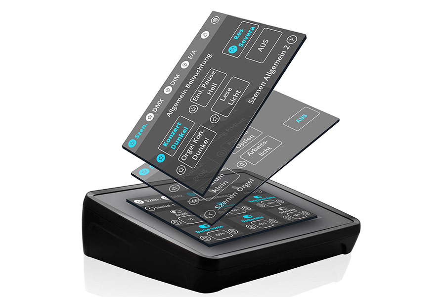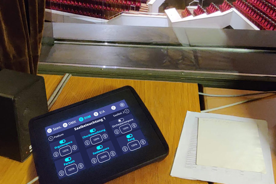 Alle Grundfunktionen blieben erhalten: Mit dem bestehenden Bühnenpult kann also auch zukünftig die gewünschte Funktion im Saal gesteuert werden. Ebenfalls konnte die Durchgangsbeleuchtung erhalten werden: Findet keine Bespielung im Saal statt, lassen sich zur Reinigung oder Besichtigung weiterhin die vorhandenen Taster im Saal betätigen.
